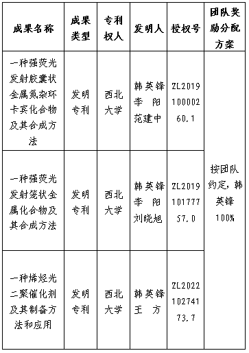 按照《米兰买球促进科技成果转化实施办法》(西大科〔2019〕5号)相关规定,拟对米兰买球化学与材料科学学院韩英锋教授作为成果负责人的3项发明专利权实施转化,现将相关信息公示如下:
