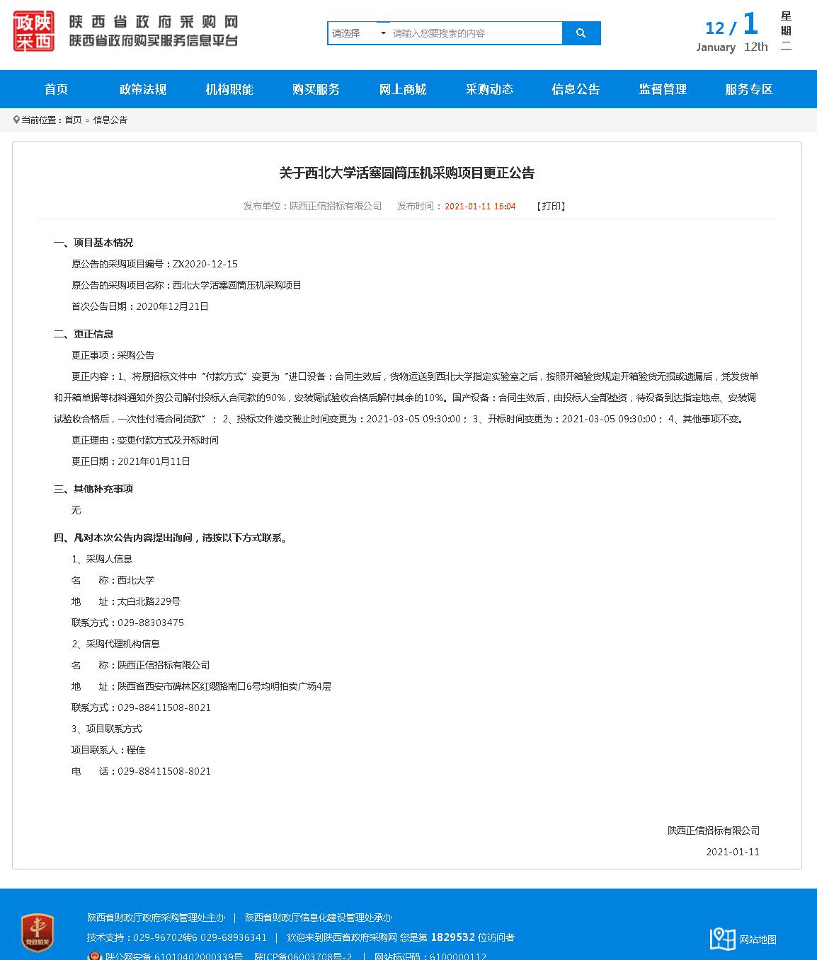 米兰买球活塞圆筒压机采购项目更正公告