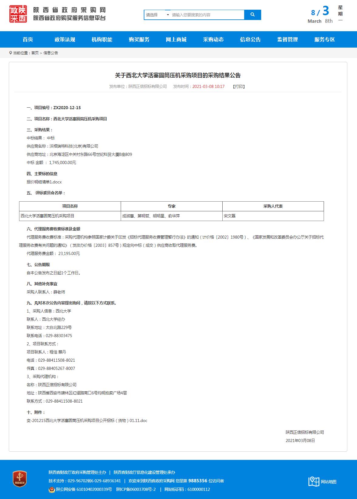 米兰买球活塞圆筒压机采购项目的采购结果公告