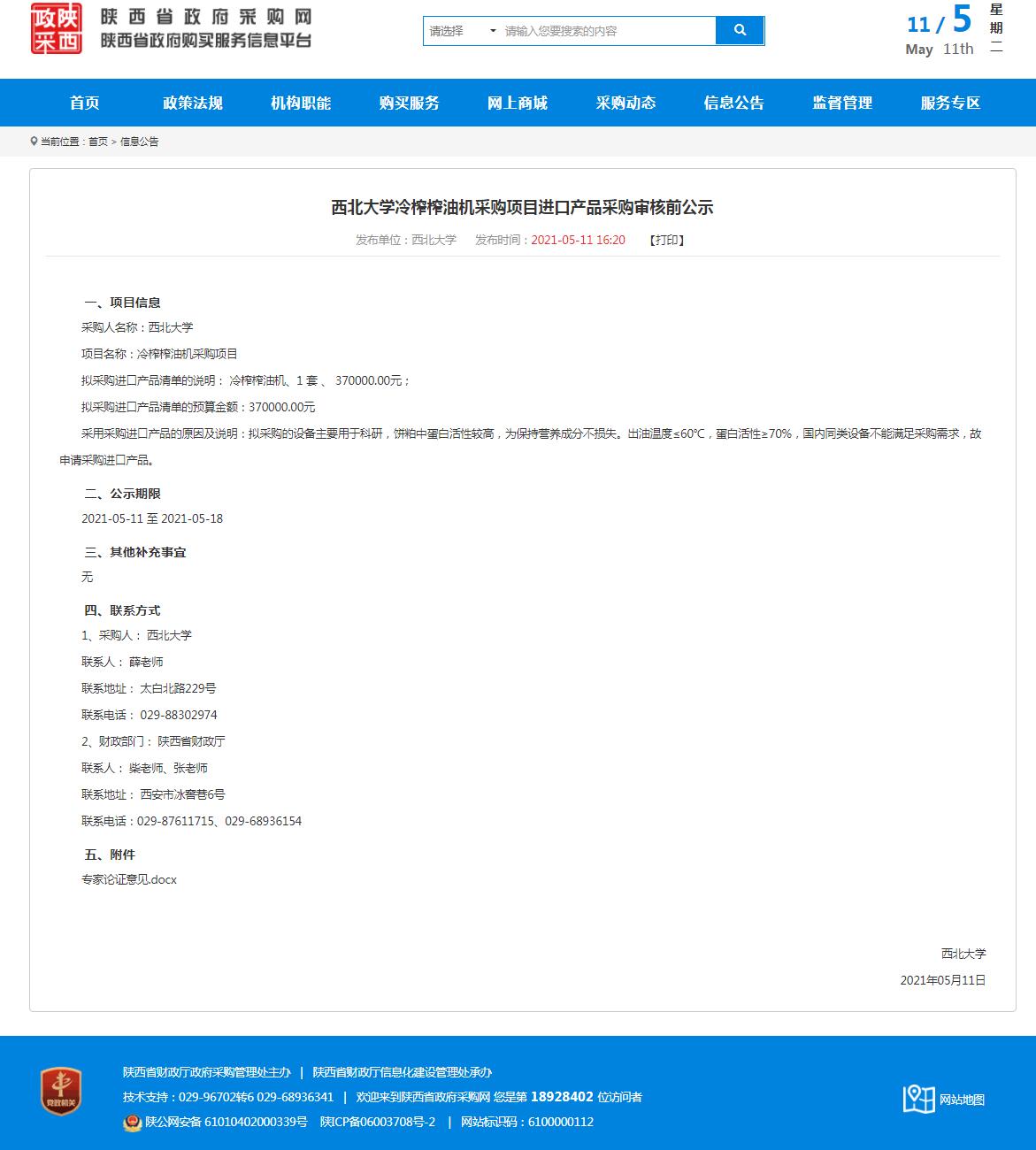 米兰买球冷榨榨油机采购项目进口产品采购审核前公示