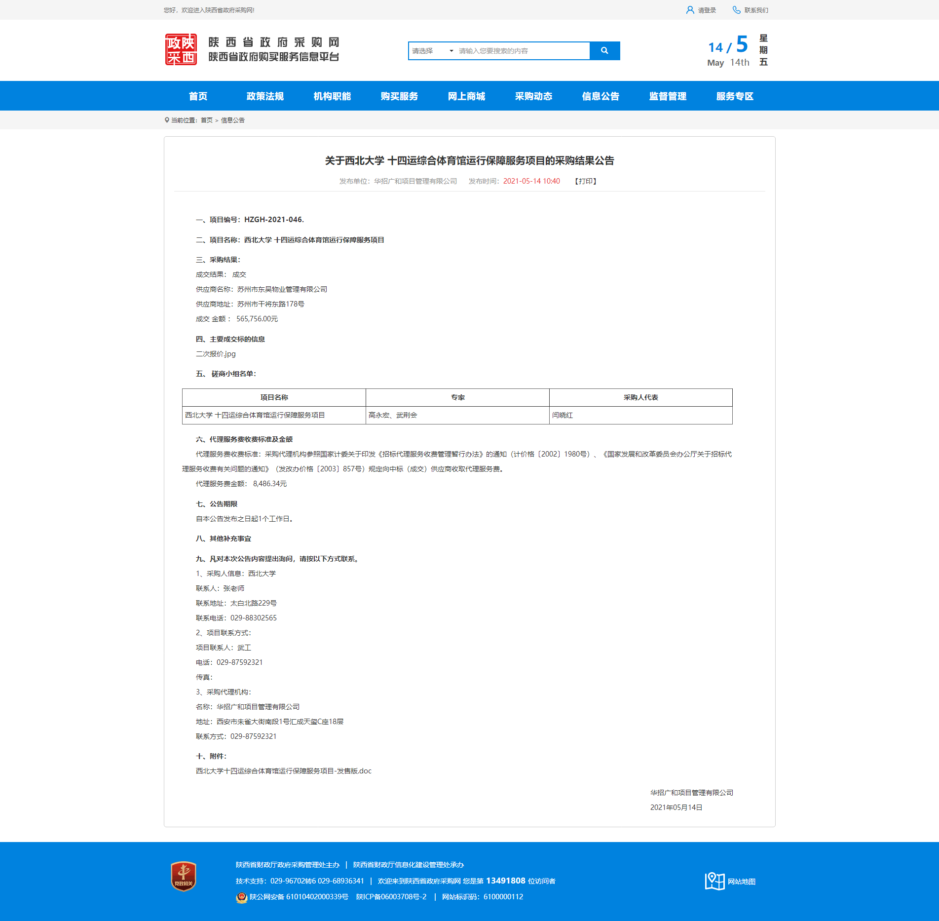 关于米兰买球十四运综合体育馆运行保障服务项目的采购结果公告