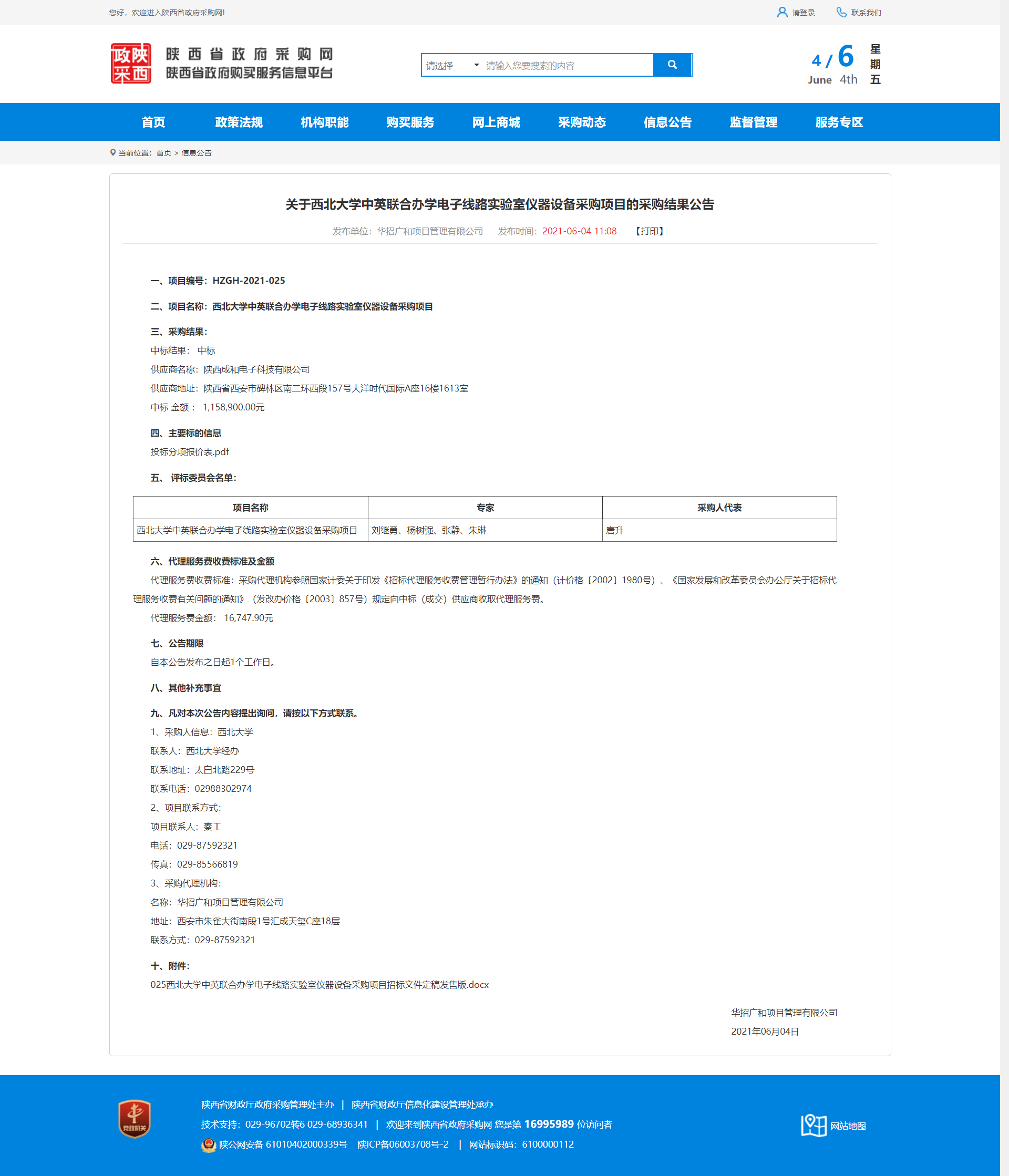 关于米兰买球中英联合办学电子线路实验室仪器设备采购项目的采购结果公告 作者: 编辑:薛利娟 时间:2021-06-04 原公告地址:http://ccgp-shaanxi.gov.cn/notice/noticeDetail.do?noticeguid=8a85be32791b87da0179d4f9ca5a7372