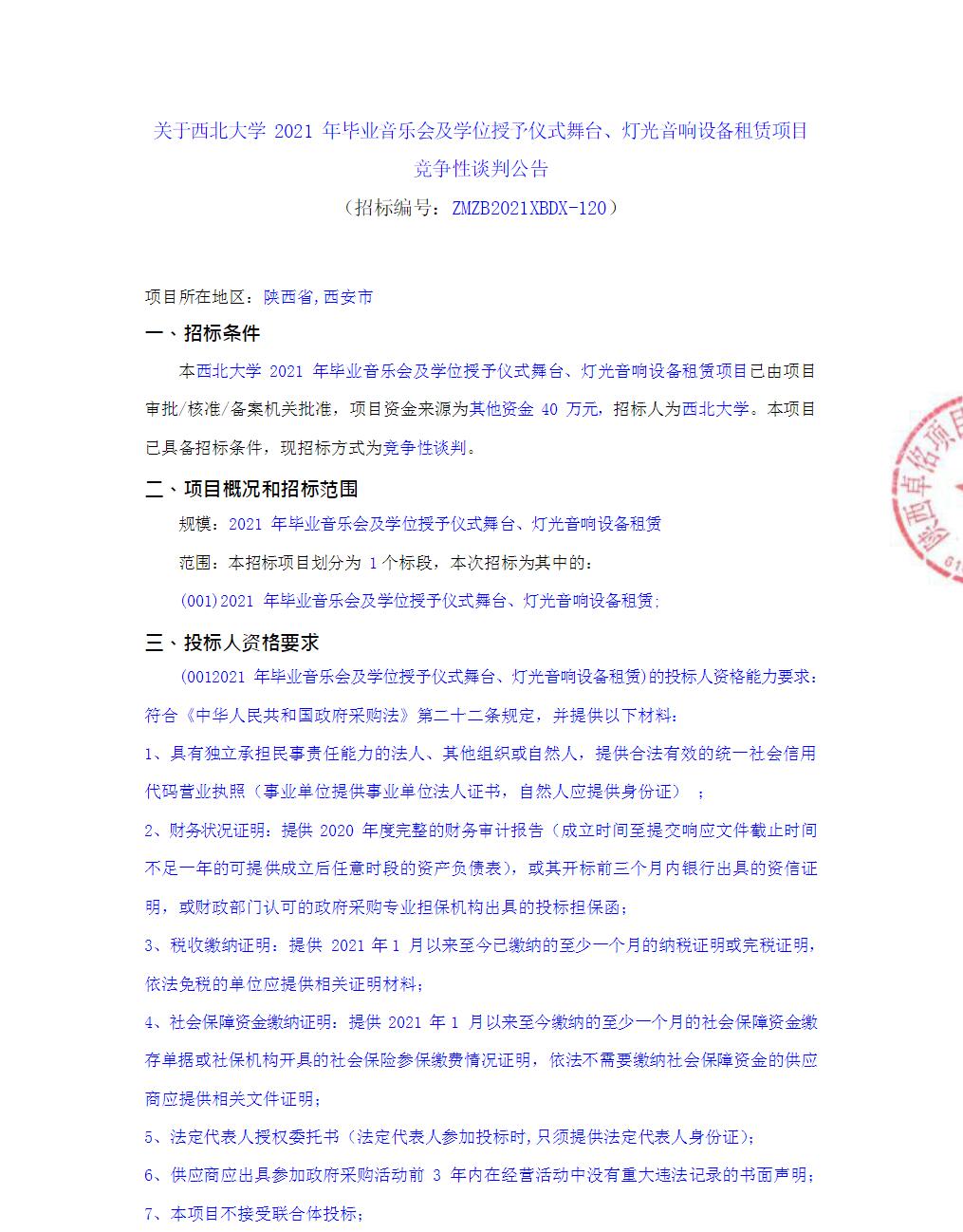 米兰买球2021年毕业音乐会及学位授予仪式舞台、灯光音响设备租赁项目竞争性谈判公告