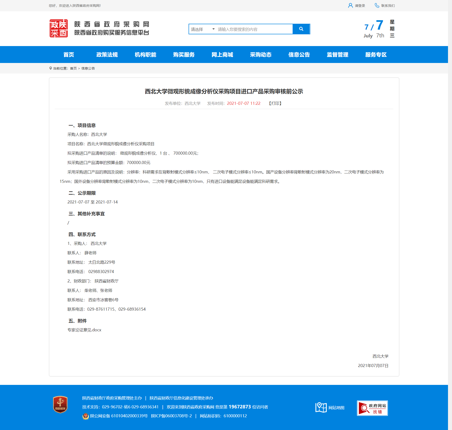 米兰买球微观形貌成像分析仪采购项目进口产品采购审核前公示 作者: 编辑:采购与招标办公室 时间:2021-07-07 原公告地址:http://www.ccgp-shaanxi.gov.cn/notice/noticeDetail.do?noticeguid=8a85be337a79620e017a7e92b5872d92