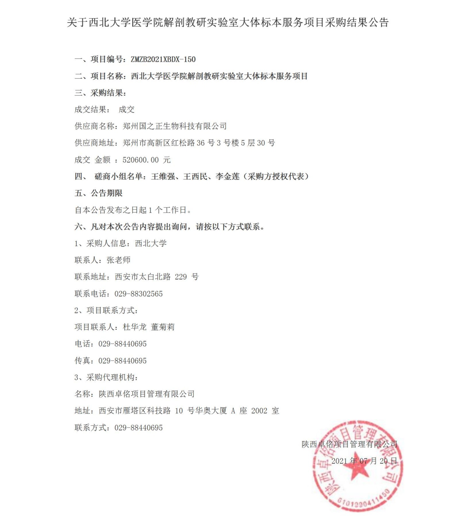 关于米兰买球医学院解剖教研实验室大体标本服务项目采购结果公告