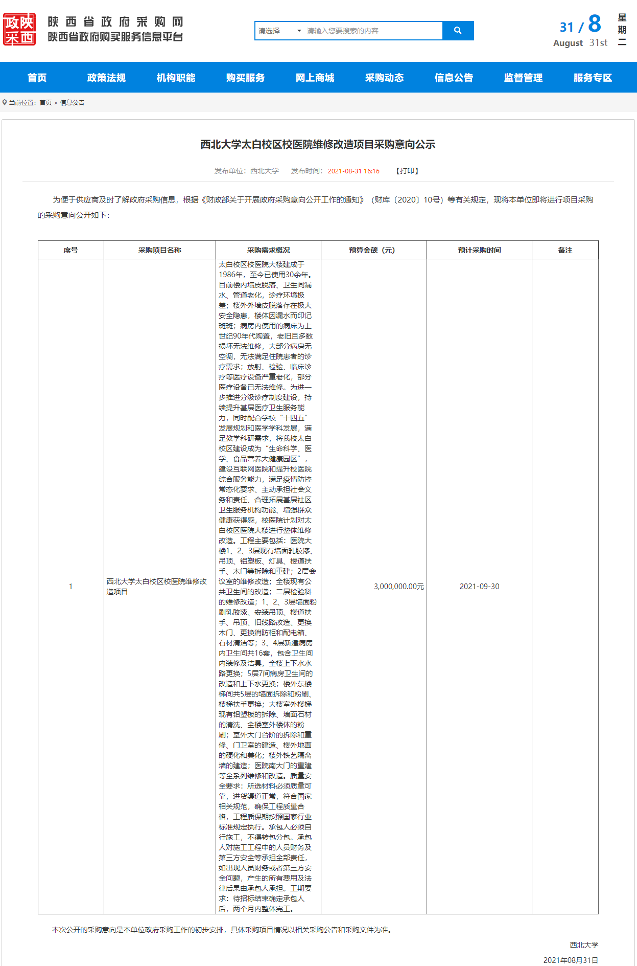 米兰买球太白校区校医院维修改造项目采购意向公示