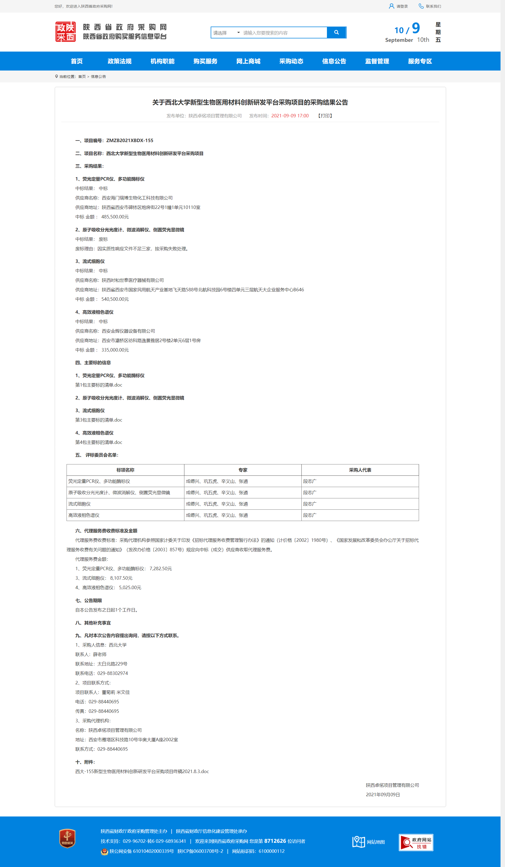 关于米兰买球新型生物医用材料创新研发平台采购项目的采购结果公告 作者: 编辑:采购与招标办公室 时间:2021-09-10 原公告地址:http://www.ccgp-shaanxi.gov.cn/notice/noticeDetail.do?noticeguid=8a85be347bc00296017bc9c746595f00