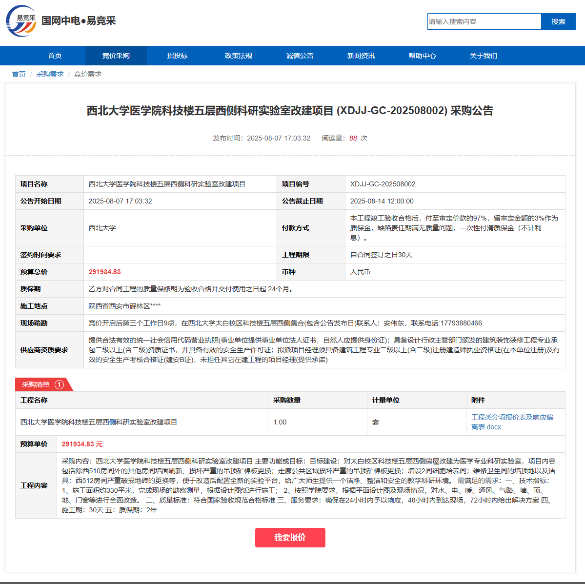 米兰买球医学院科技楼五层西侧科研实验室改建项目 (XDJJ-GC-202508002) 采购公告 作者: 编辑:党丹珩 时间:2025-08-08 公告地址:https://www.ejingcai.com.cn/site/bidding/detail/19914