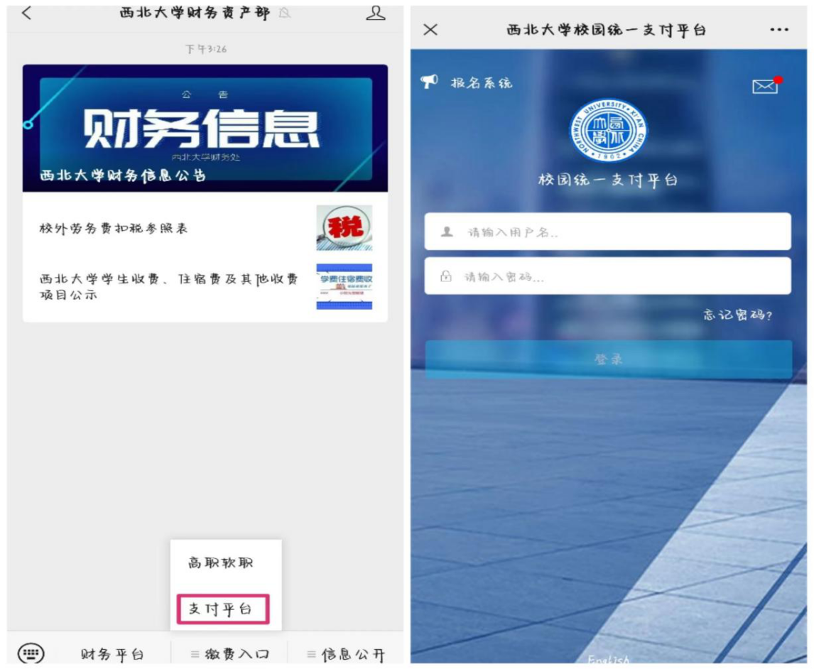 手机端:关注“米兰买球财务资产部”微信公众号,选择“缴费入口”点击“支付平台”进入。(见下图)