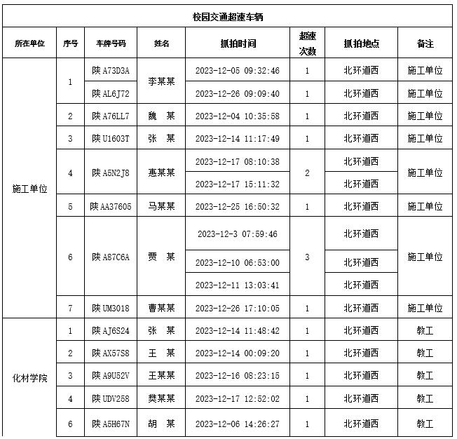 在长安校区主环道的超速车辆共计:49辆,超速共计:59次,其中教职工车辆25辆,学生车辆10辆,家属及子女车辆1辆,施工单位车辆8辆,外聘人员车辆6辆。