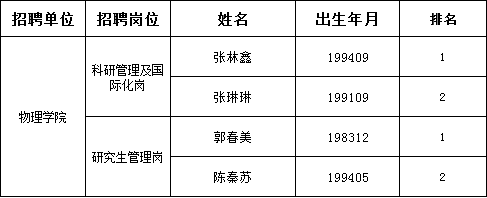 物理学院公开招聘B类人事代理人员结果公示 作者: 编辑: 时间:2019-06-13 09:18 根据《米兰买球物理学院公开招聘管理人员公告》的工作安排,经自主报名、资格审核、初试和复试环节,现将拟录用人员名单公示如下:公示时间:2019年6月13日至2019年6月15日。公示期内,如有异议,请以书面形式向米兰买球物理学院反映。联系电话:88303384。物理学院2019年6月13日