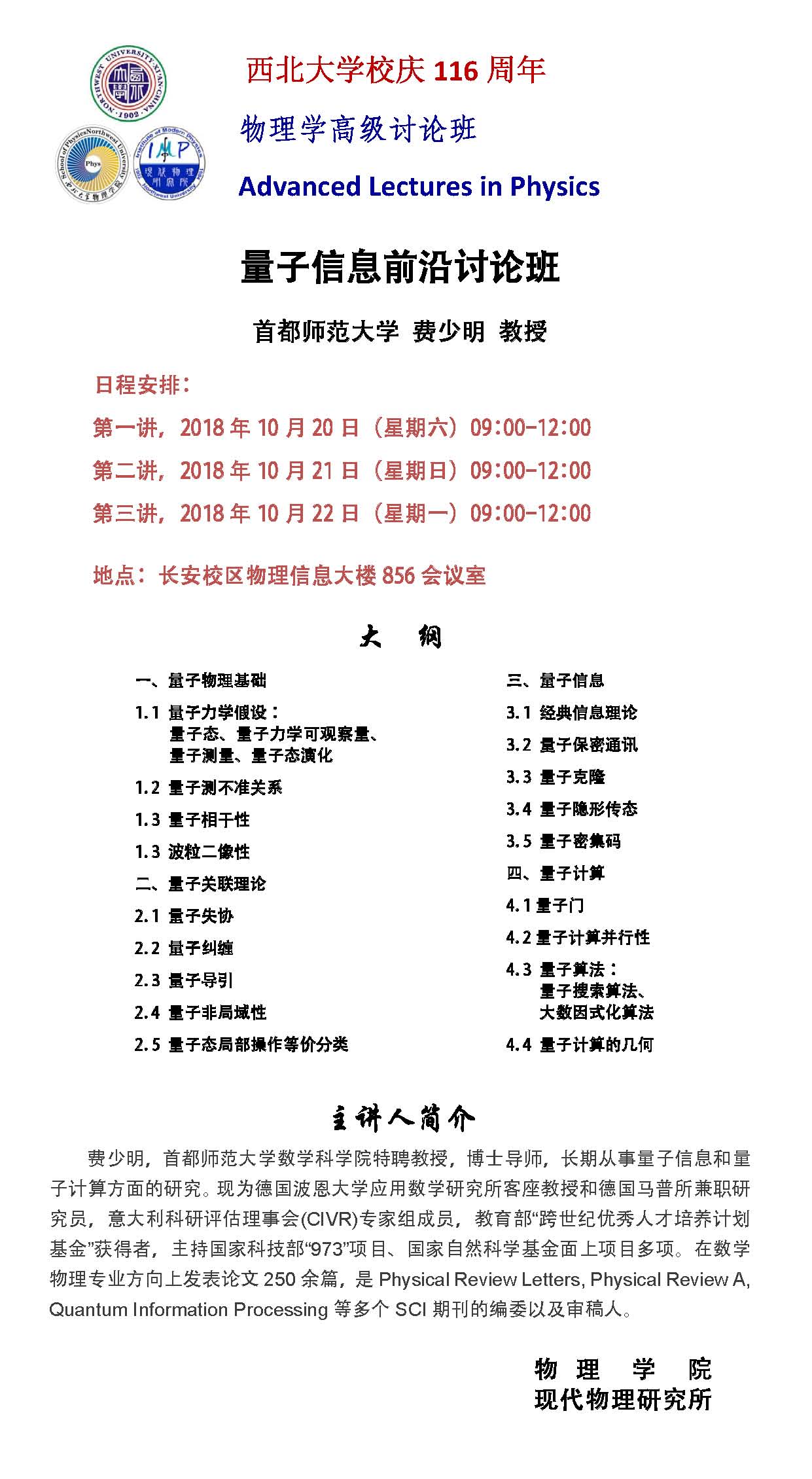 米兰买球校庆116周年物理学高级讨论班-量子信息前沿
