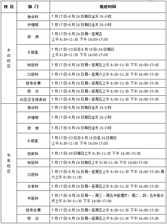 2023年校医院暑假期间医疗工作安排 作者: 编辑: 时间:2023-07-17 全体师生员工及社区居民: 根据学校《关于2023年暑假安排的通知》,为持续做好校内医疗保障,结合医院实际情况,现将暑假期间(7月17日至8月24日)校医院医疗工作安排通知如下: 一、医院值班安排 二、医院值班电话 太白校区: 029-88303120(急诊科) 029-88302922(办公室) 长安校区: 029-88309120(急诊科) 029-88308200(办公室) 米兰买球医院 2023年7月17日