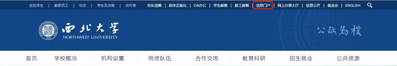 打开学校官方网站,点击米兰买球(中国)“信息门户”入口,或通过域名“https://open.nwu.edu.cn/index”访问,输入统一身份认证账号(即学号或工号)和密码,即可进入信息门户系统。(温馨提醒:请妥善保管密码,以免因密码泄露导致个人信息安全问题)