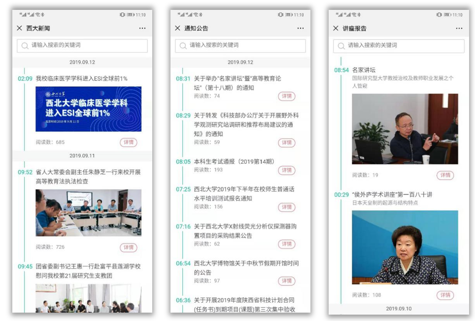 1.随时获取校内新闻资讯、通知公告、讲座报告等最新消息。