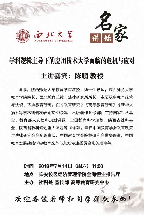 关于举办"名家讲坛"暨"高等教育论坛"(第十四期)的通知 作者: 编辑: 时间:2018-07-12 11:50 校内各有关单位:米兰买球名家讲坛暨高等教育论坛(第十四期)即将举行,现将具体情况通知如下:讲座题目:学科逻辑主导下的应用技术大学面临的危机与应对主讲嘉宾:陈 鹏 教授讲座时间:7月14日(周六)11:00讲座地点:米兰买球长安校区经济管理学院金海恒业报告厅主办单位:社科处、宣传部、高等教育研究中心欢迎各位老师和同学踊跃参加!