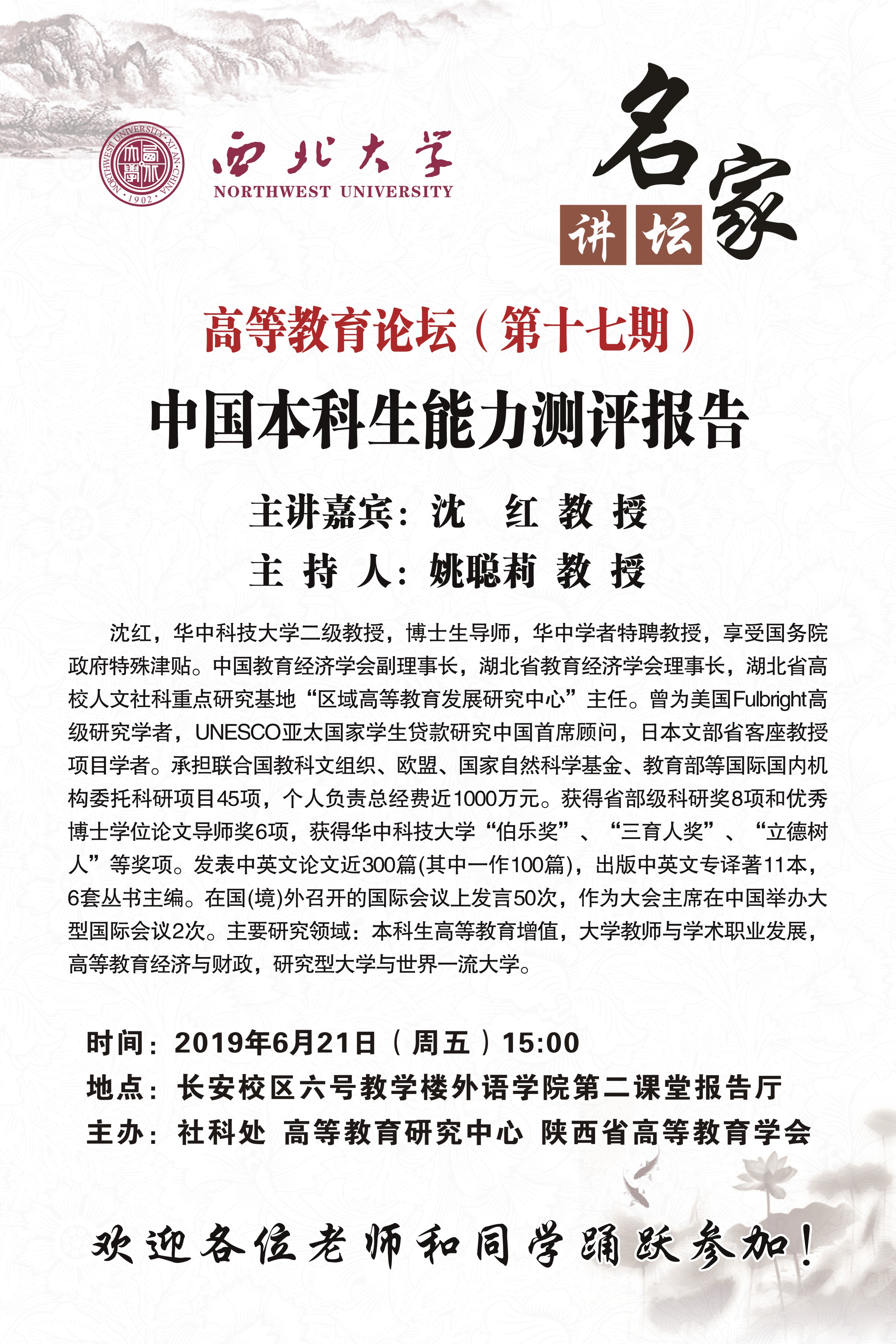 关于举办"名家讲坛"暨"高等教育论坛"(第十七期)的通知 作者: 编辑: 时间:2019-06-19 10:43 校内各有关单位:米兰买球名家讲坛暨高等教育论坛(第十七期)即将举行,现将具体情况通知如下:讲座题目:中国本科生能力测评报告主讲嘉宾:沈 红 教授讲座时间:6月21日(周五)15:00讲座地点:长安校区六号教学楼外语学院第二课堂报告厅主办单位:社科处、高等教育研究中心、陕西省高等教育学会欢迎各位老师和同学踊跃参加!
