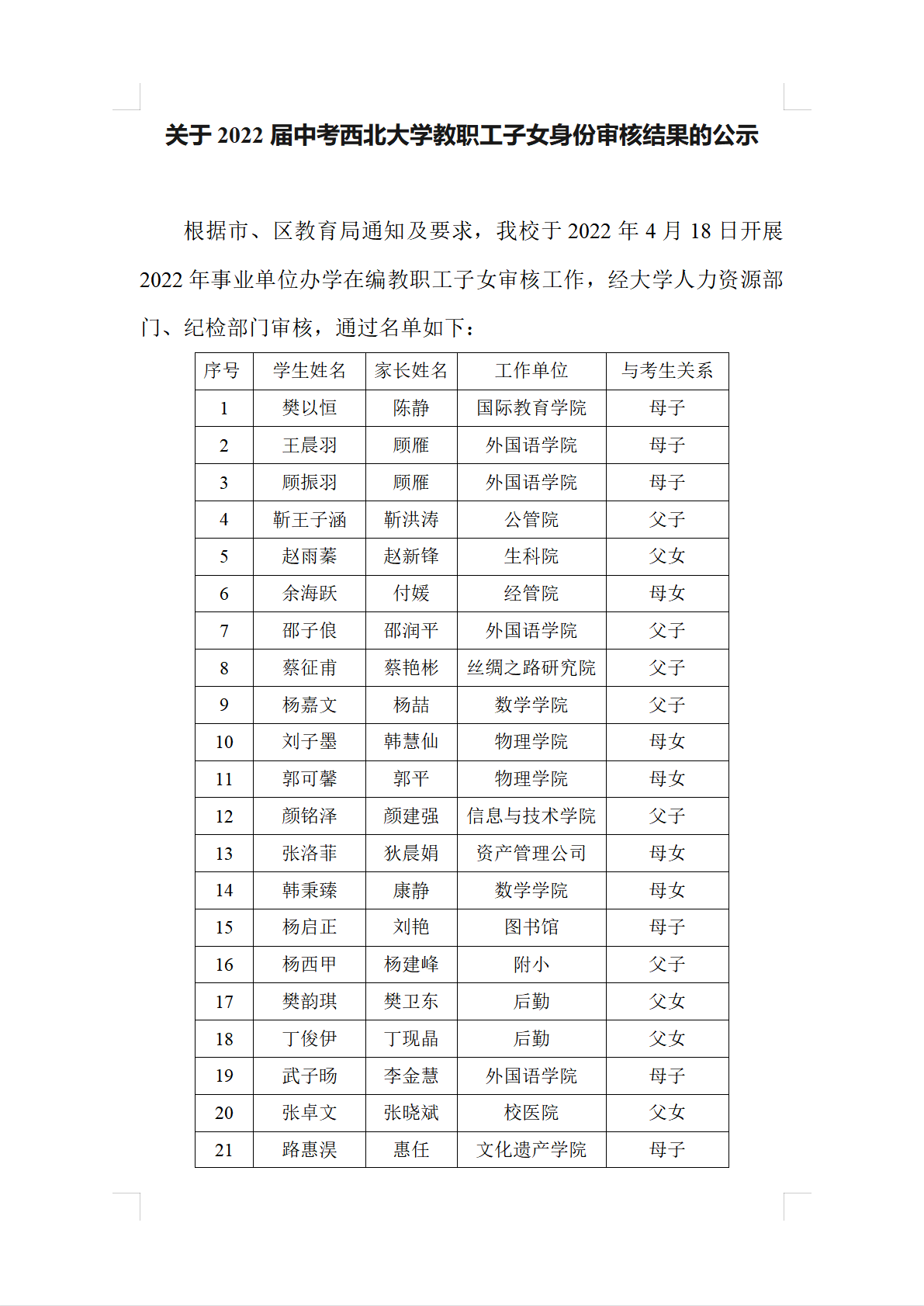关于2022届中考米兰买球教职工子女身份审核结果的公示