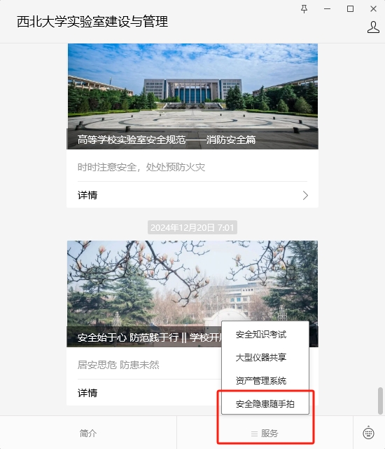 (1)关注“米兰买球实验室建设与管理”微信公众号,选择“服务”—“安全隐患随手拍”,填写个人信息、隐患描述等,并上传隐患照片。
