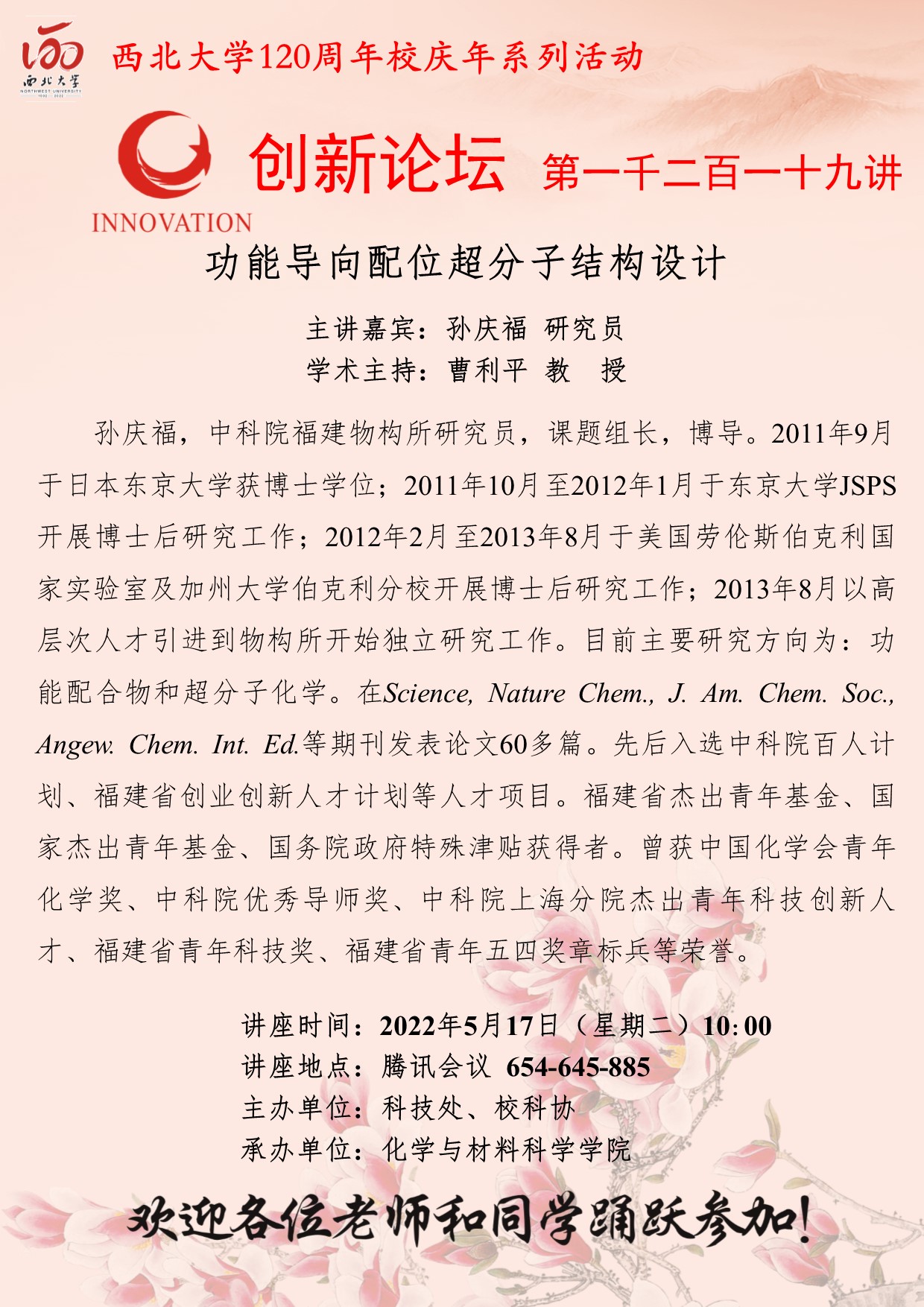 米兰买球创新论坛第一千二百二十讲暨120周年校庆年系列活动:杯芳烃—从大环受体到生物医用超分子材料