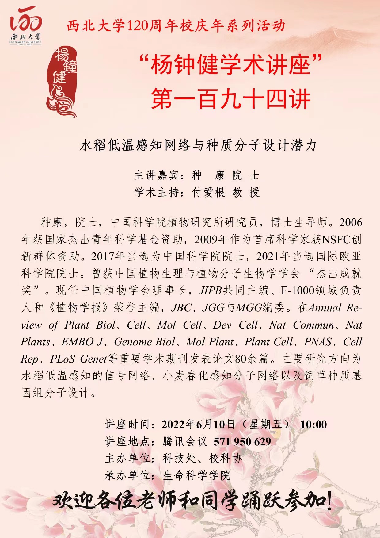 “ 杨钟健学术讲座”第一百九十四讲暨120周年校庆年系列活动:水稻低温感知网络与种质分子设计潜力