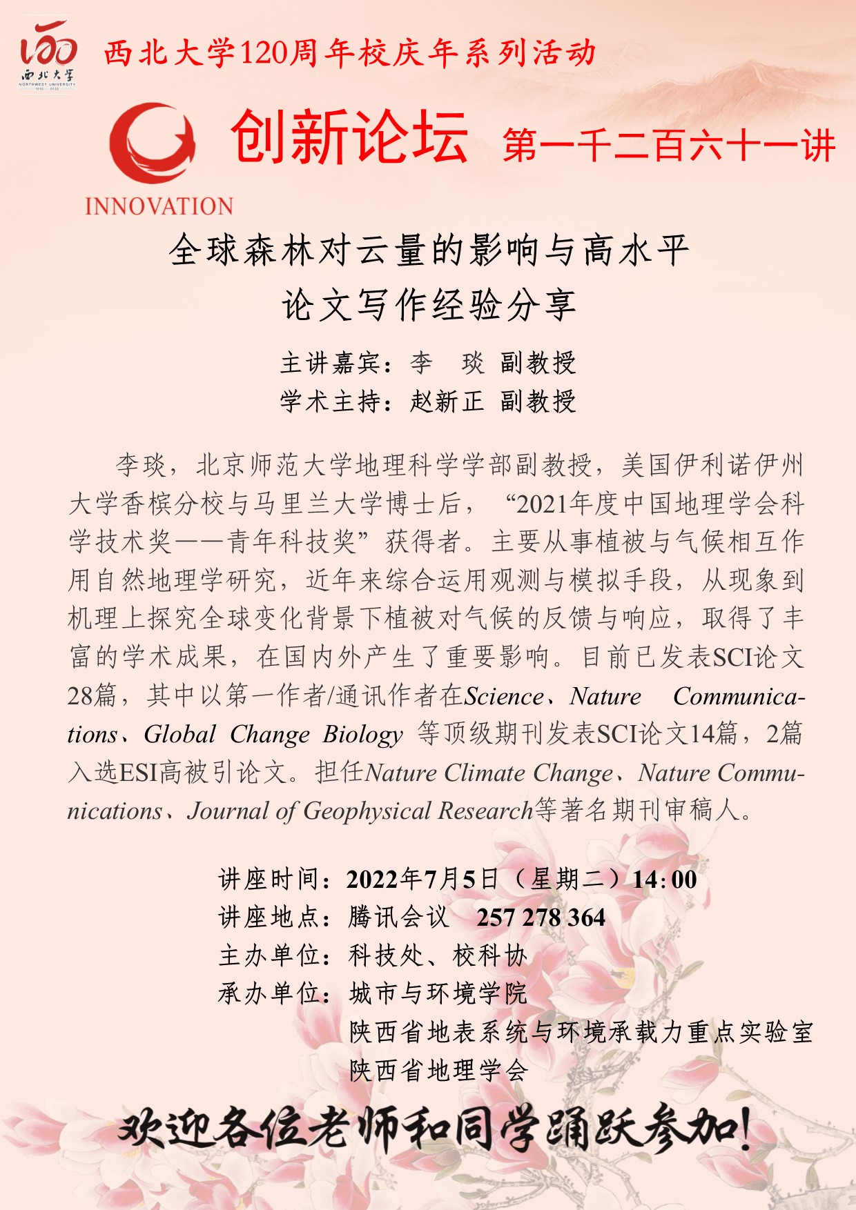 米兰买球创新论坛第一千二百六十一讲暨120周年校庆年系列活动:全球森林对云量的影响与高水平论文写作经验分享