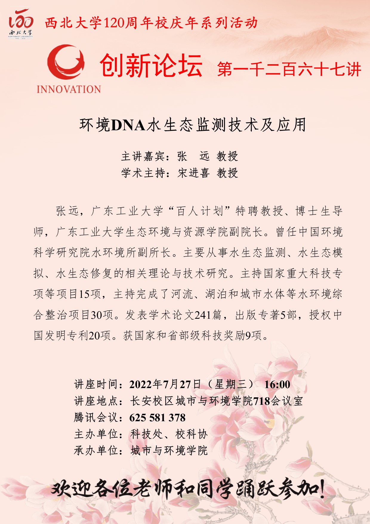 米兰买球创新论坛第一千二百六十七讲暨120周年校庆年系列活动:环境DNA水生态监测技术及应用