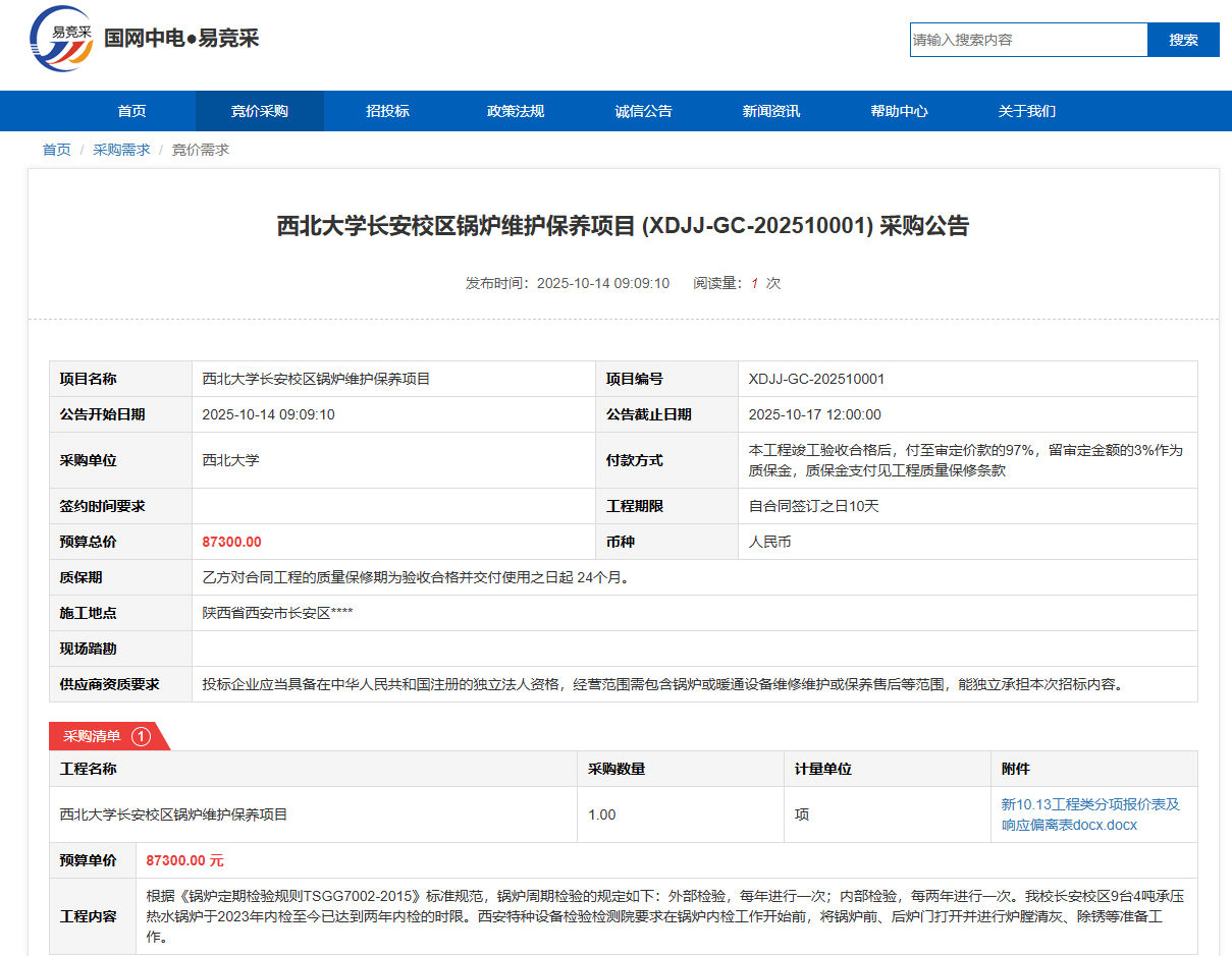 米兰买球长安校区锅炉维护保养项目(XDJJ-GC-202510001)竞价采购公告