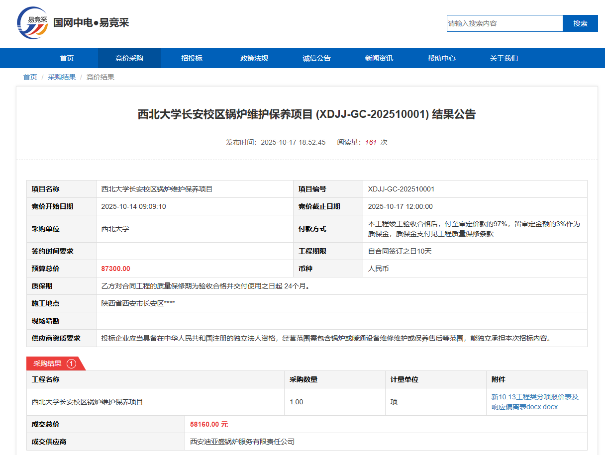 米兰买球长安校区锅炉维护保养项目(XDJJ-GC-202510001)竞价结果公告