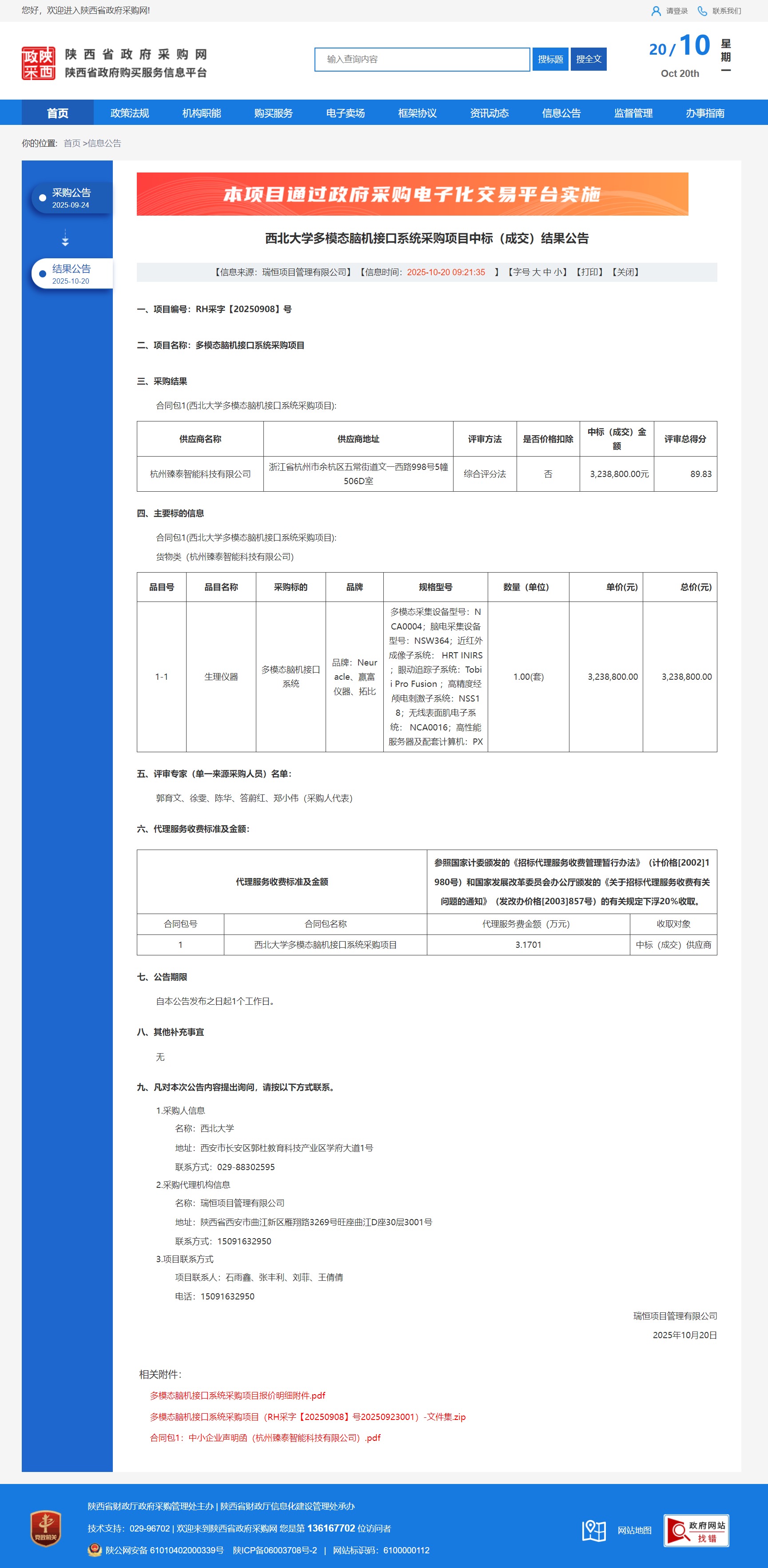 米兰买球多模态脑机接口系统采购项目中标(成交)结果公告