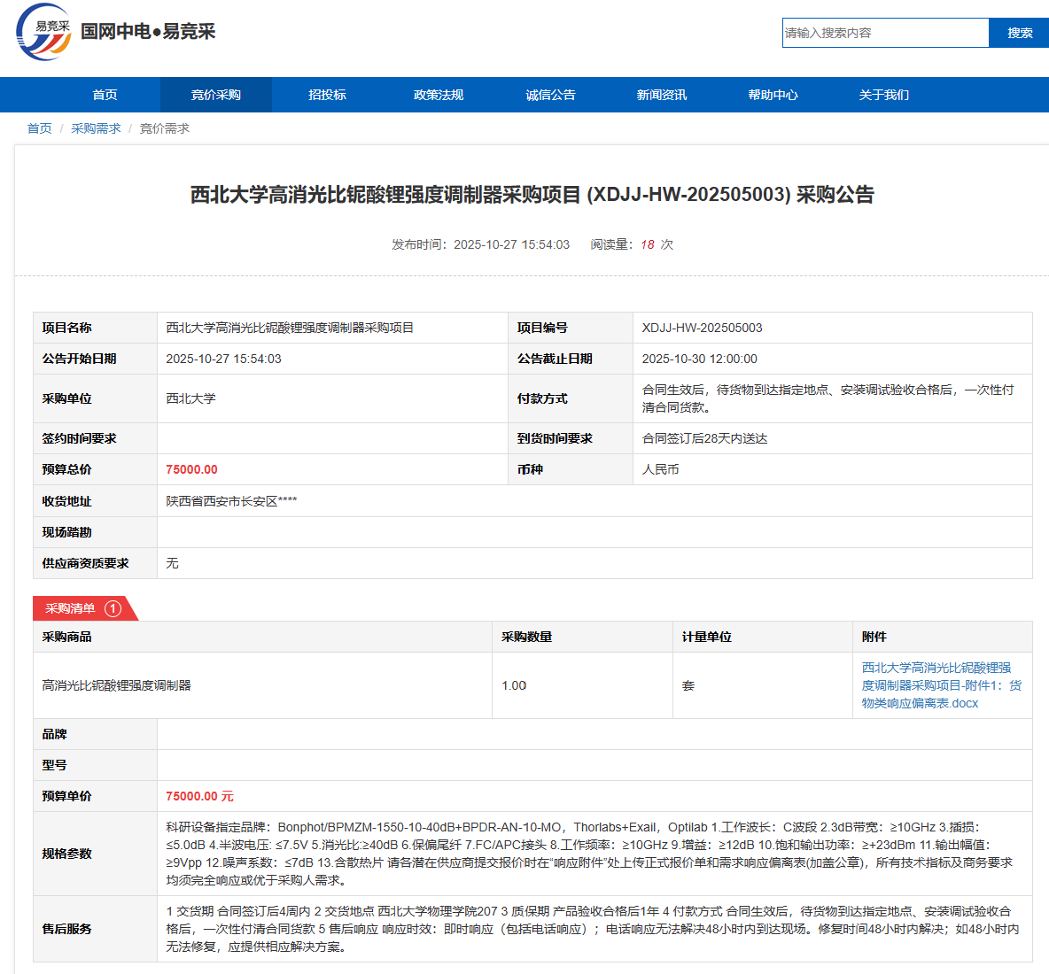 米兰买球高消光比铌酸锂强度调制器采购项目(XDJJ-HW-202505003)竞价采购公告