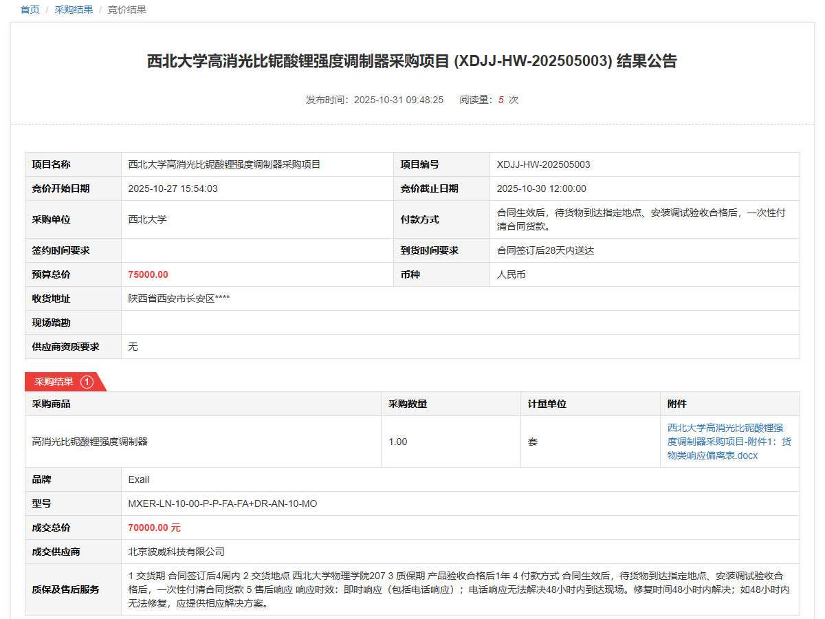 米兰买球高消光比铌酸锂强度调制器采购项目(XDJJ-HW-202505003)竞价结果公告