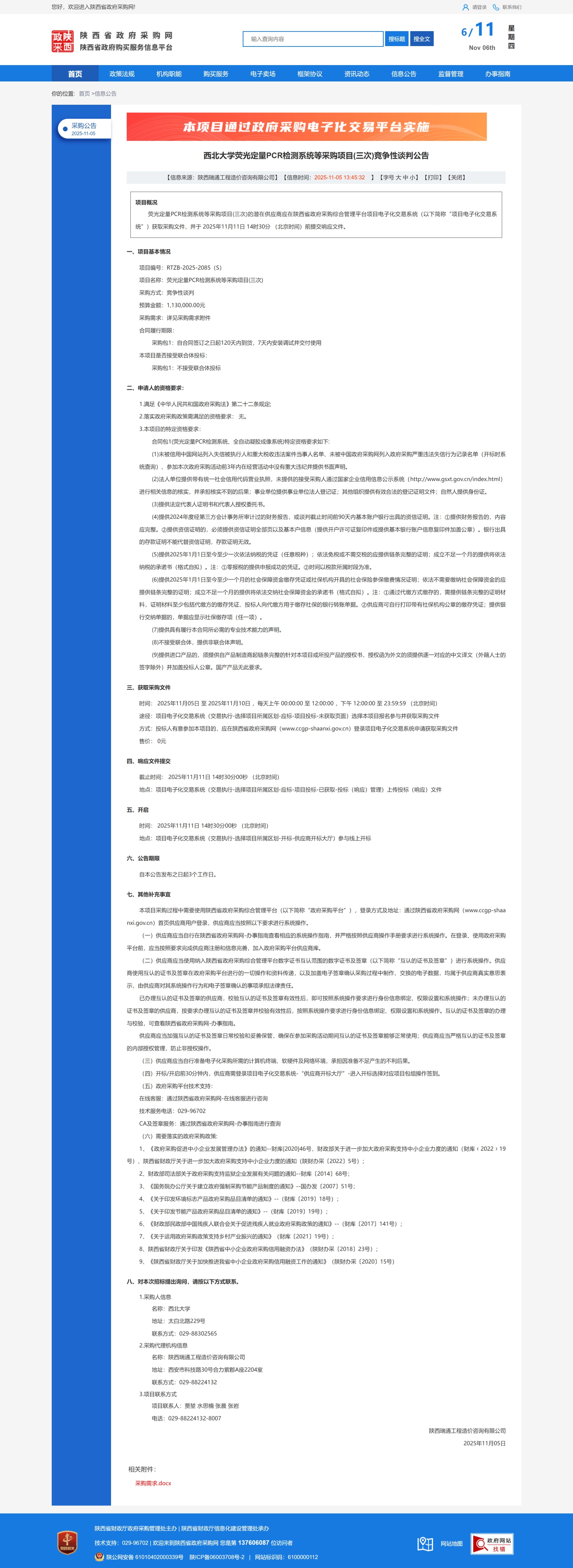 米兰买球荧光定量PCR检测系统等采购项目(三次)竞争性谈判公告 作者: 编辑:国有资产管理处 时间:2025-11-06 原公告链接:https://www.ccgp-shaanxi.gov.cn/freecms/site/shaanxi/ggxx/info/2025/8a69c9fd99f7767f019a5285c1940c9a.html?noticeType=001013¬iceId=d91ac8d2-ba0c-11f0-8063-08c0eb20c666
