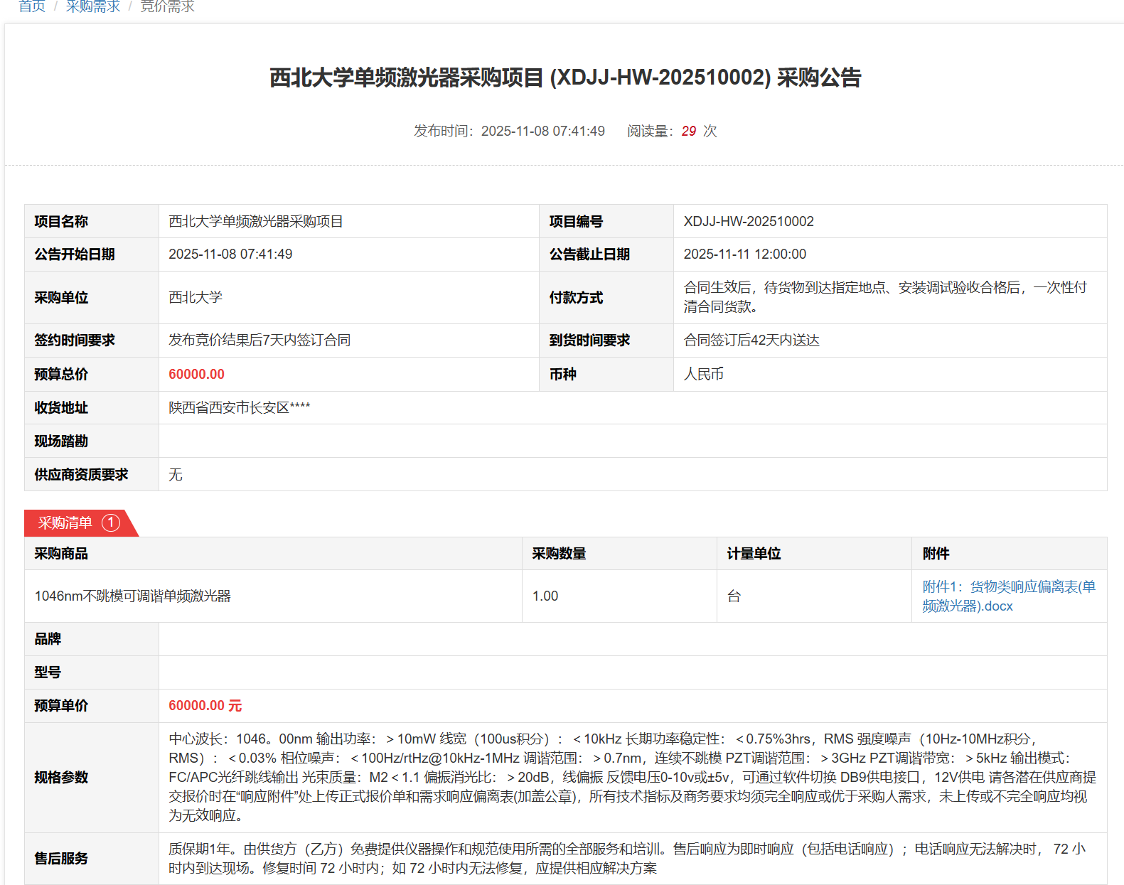 米兰买球单频激光器采购项目(XDJJ-HW-202510002)竞价采购公告