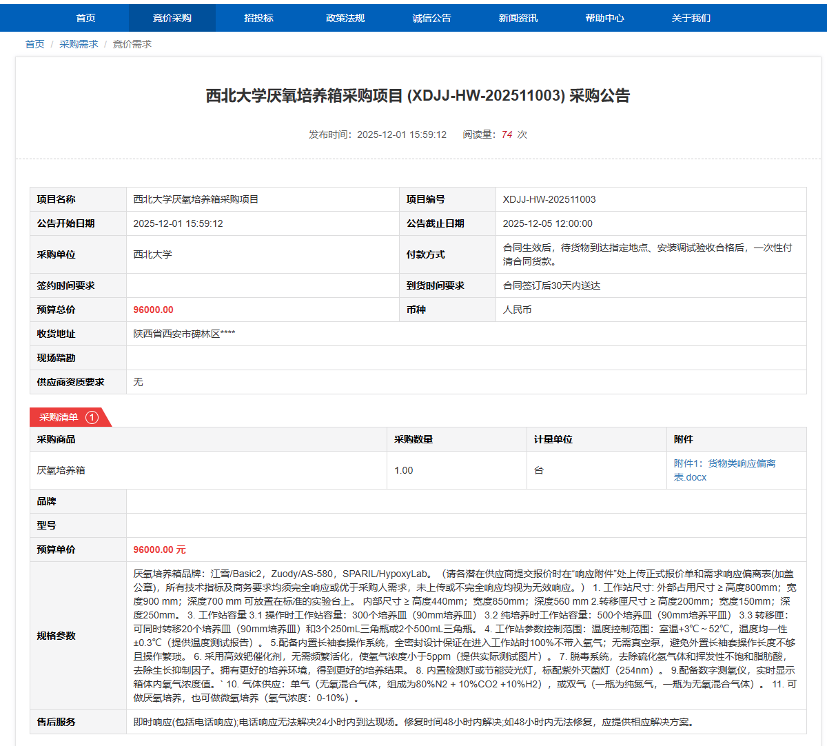 米兰买球厌氧培养箱采购项目(XDJJ-HW-202511003)竞价采购公告