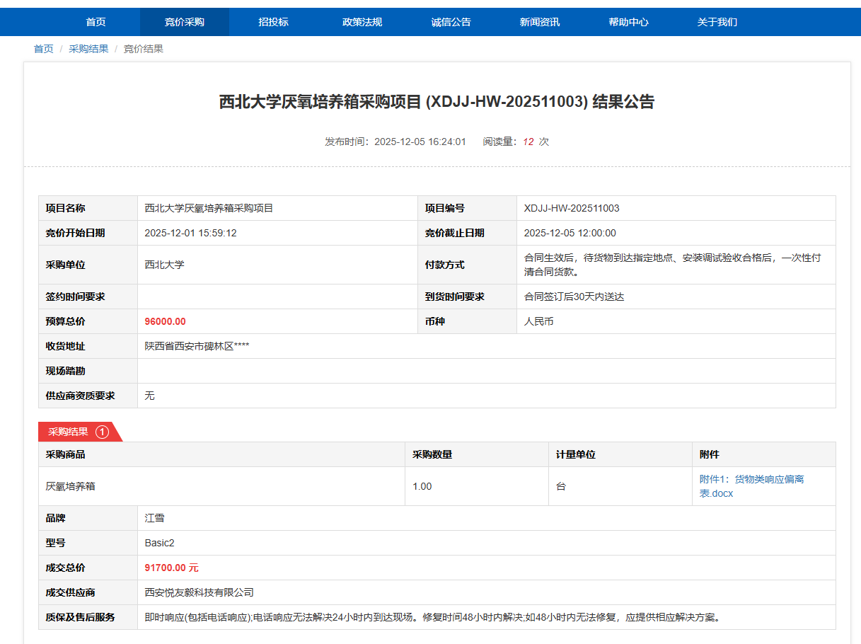 米兰买球厌氧培养箱采购项目(XDJJ-HW-202511003)竞价结果公告