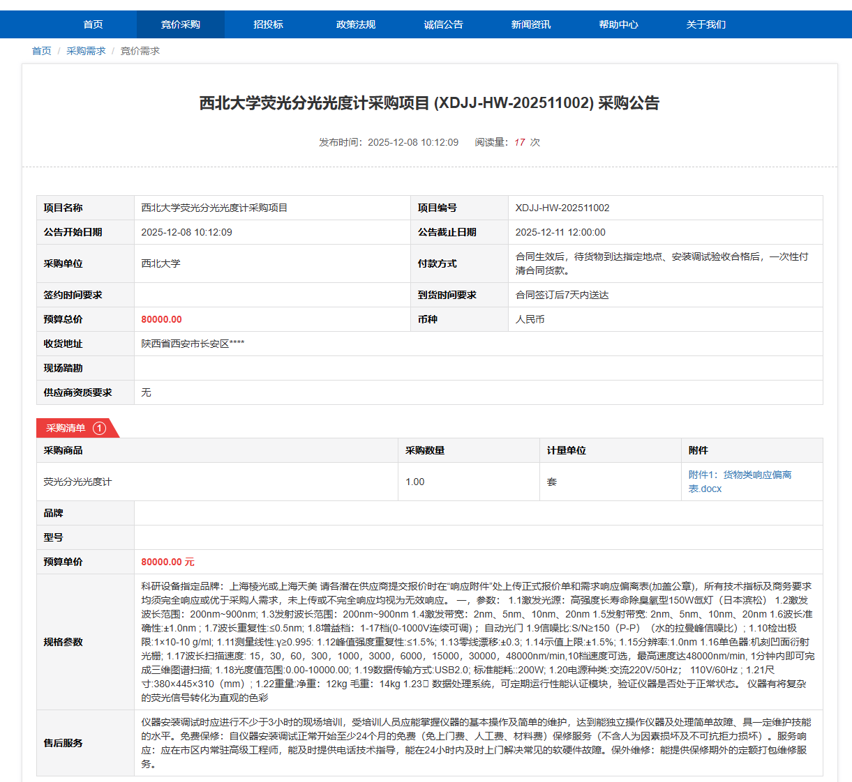 米兰买球荧光分光光度计采购项目(XDJJ-HW-202511002)竞价采购公告