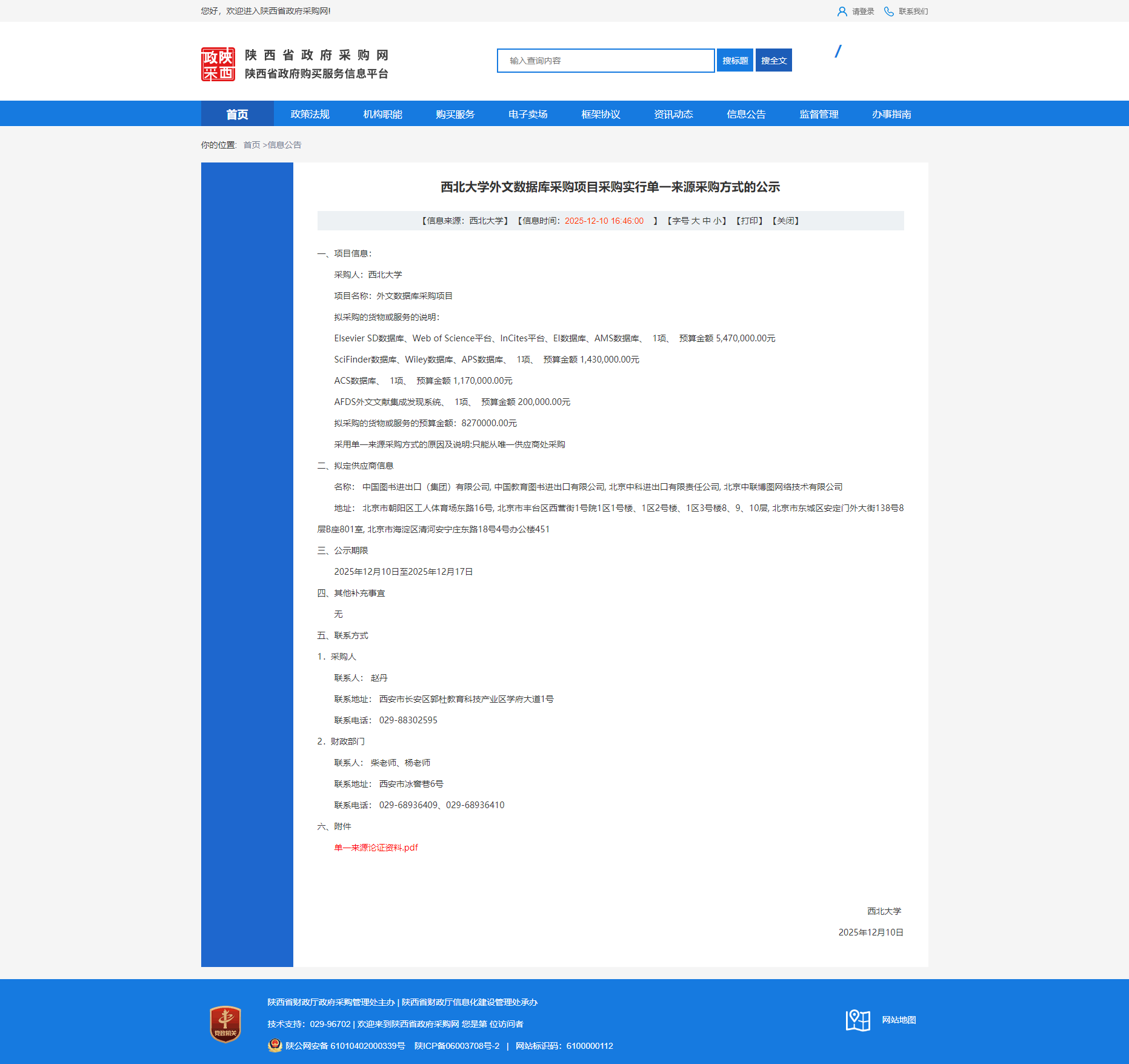 米兰买球外文数据库采购项目采购实行单一来源采购方式的公示