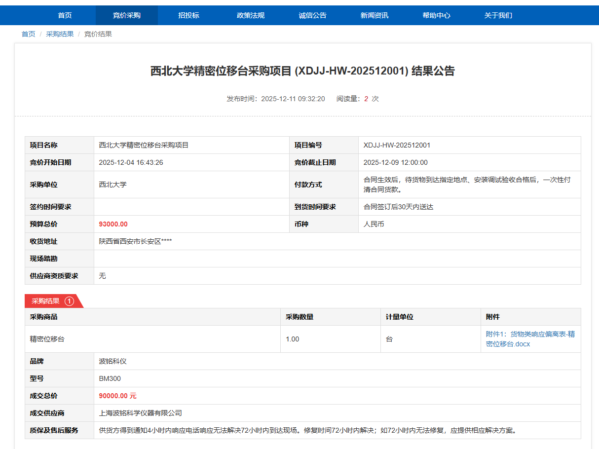 米兰买球精密位移台采购项目(XDJJ-HW-202512001)竞价结果公告
