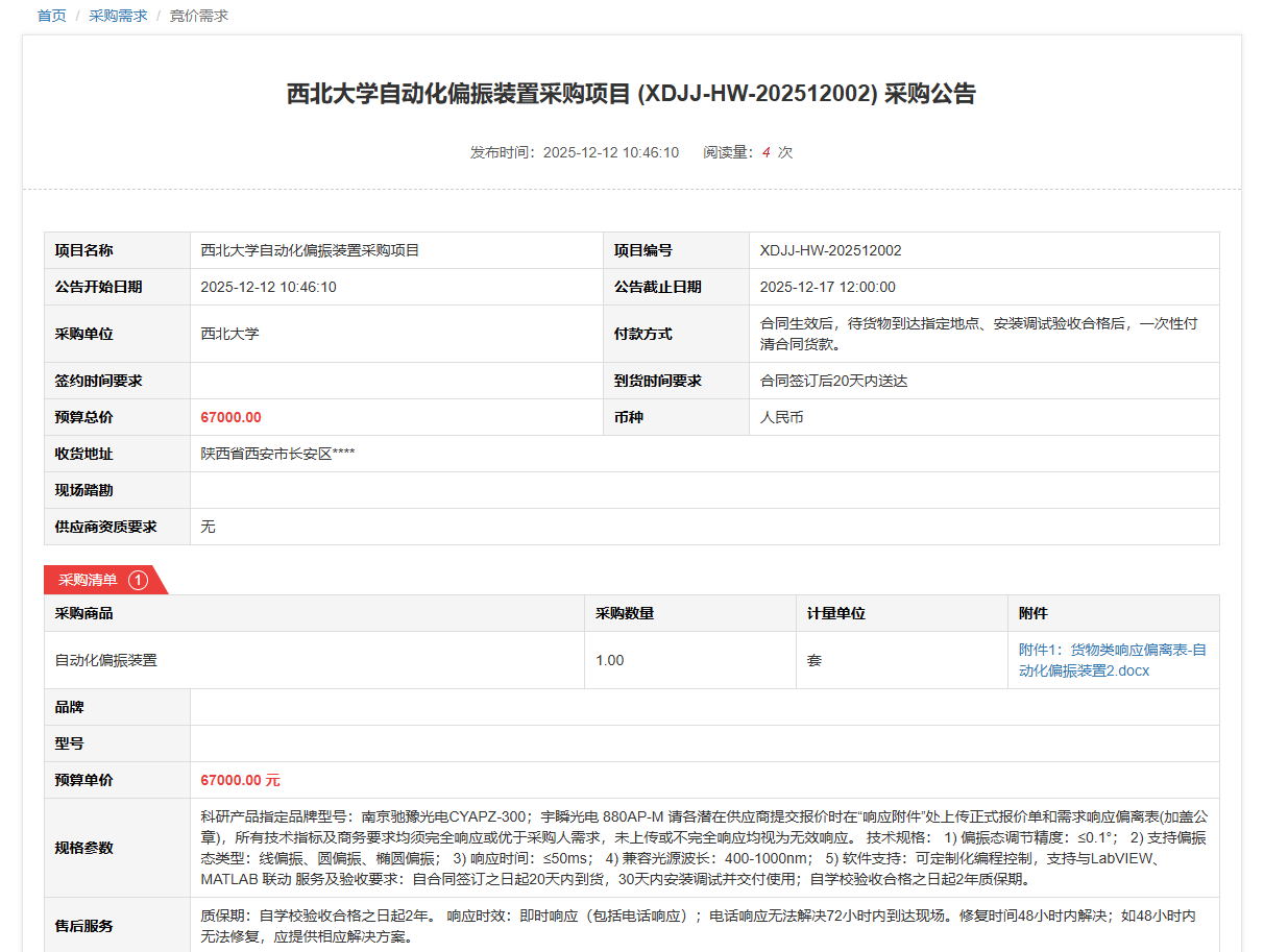 米兰买球自动化偏振装置采购项目(XDJJ-HW-202512002)竞价采购公告