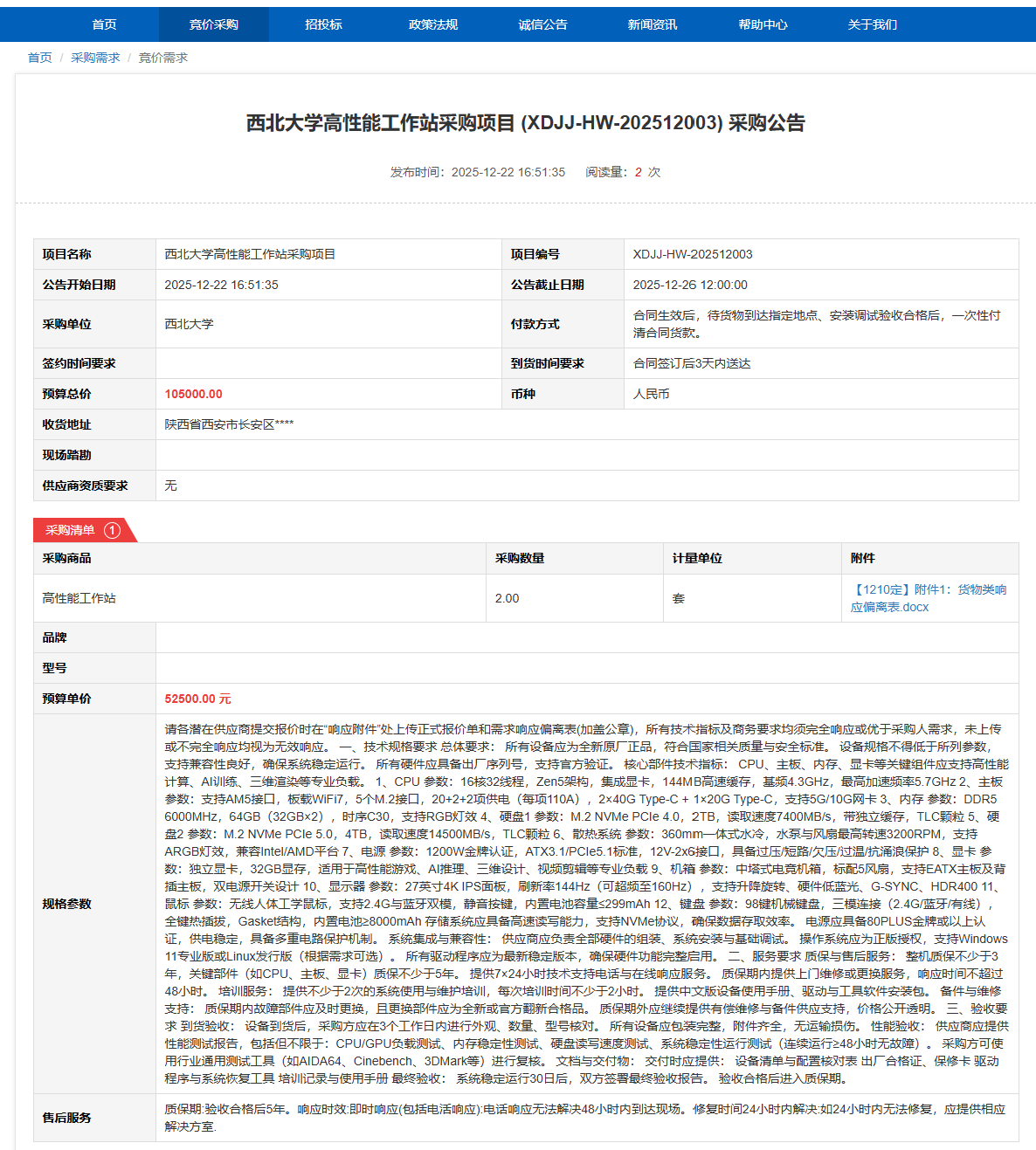 米兰买球高性能工作站采购项目(XDJJ-HW-202512003)竞价采购公告