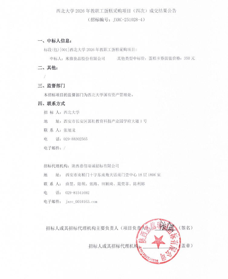 米兰买球2026年教职工蛋糕采购项目(四次)成交结果公告