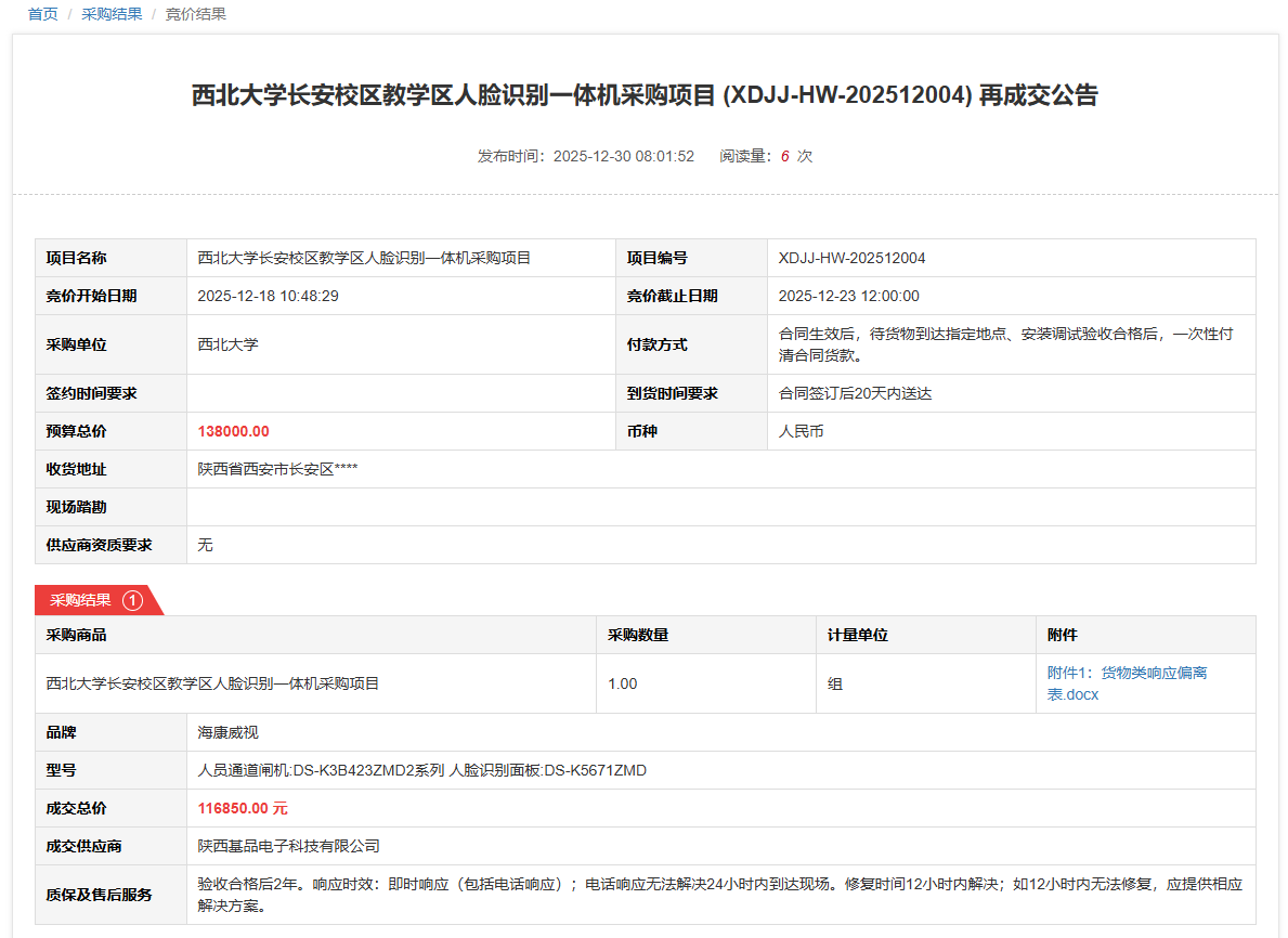 米兰买球长安校区教学区人脸识别一体机采购项目(XDJJ-HW-202512004)竞价再成交公告