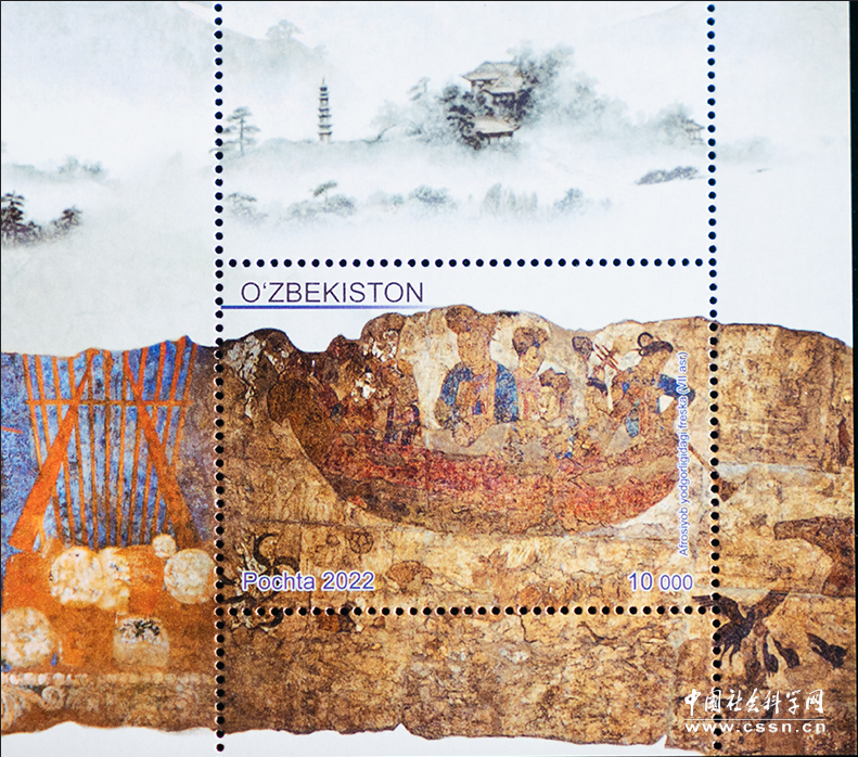 此次发行的邮票题材选择用心精巧。其中,安伽墓围屏石榻由陕西省考古研究院在中国西安发掘,浮雕图案描绘了北周时期粟特人在中国的生活场景;阿弗拉西阿卜遗址彩绘壁画,是在乌兹别克斯坦撒马尔罕阿弗拉西阿卜古城遗址发现的壁画,描绘了唐朝中国人泛舟的生动场景。两幅精美画面展现了1300多年前,丝路沿线人民友好往来,文化繁荣的景象。浮雕、壁画的出土地西安、撒马尔罕同为历史文化名城,也于2013年结为“丝路友好城市”。