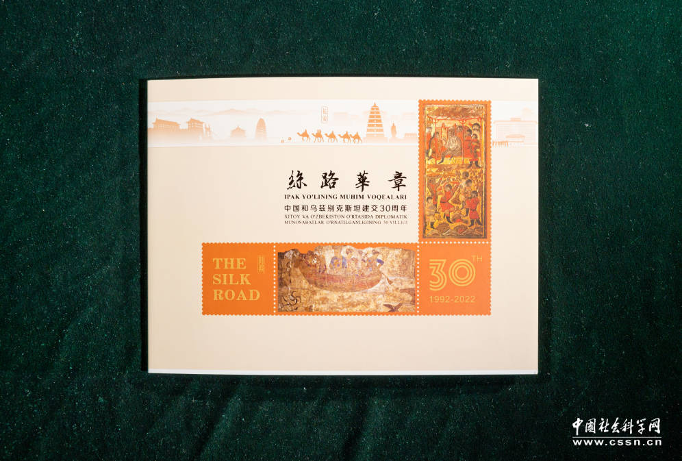 以这两组邮票组成的《丝路华章》邮折,是丝绸之路考古文化的集锦。邮折的左部主体是乌方邮票,右部主体是中方邮票,中间是中国美术考古的开创者王子云在上世纪40年代创作的《西北走廊胜迹图》,背面是邮票图案的介绍。