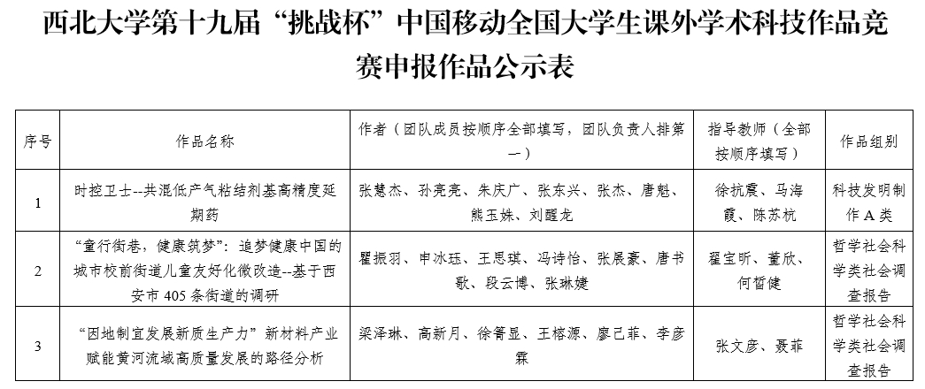 根据共青团中央等《关于组织开展第十九届“挑战杯”中国移动全国大学生课外学术科技作品竞赛的通知》要求,根据省赛获奖情况、作品历次修改情况及专家意见,校团委拟从米兰买球在第十五届“挑战杯”陕汽集团陕西省大学生课外学术科技作品竞赛获得特等奖的作品中推荐《时控卫士--共混低产气粘结剂基高精度延期药》等3件作品参加第十九届“挑战杯”中国移动全国大学生课外学术科技作品竞赛。现予以公示,公示期为2025年6月18日-22日。公示期间如有异议,请以书面形式向校团委反映。