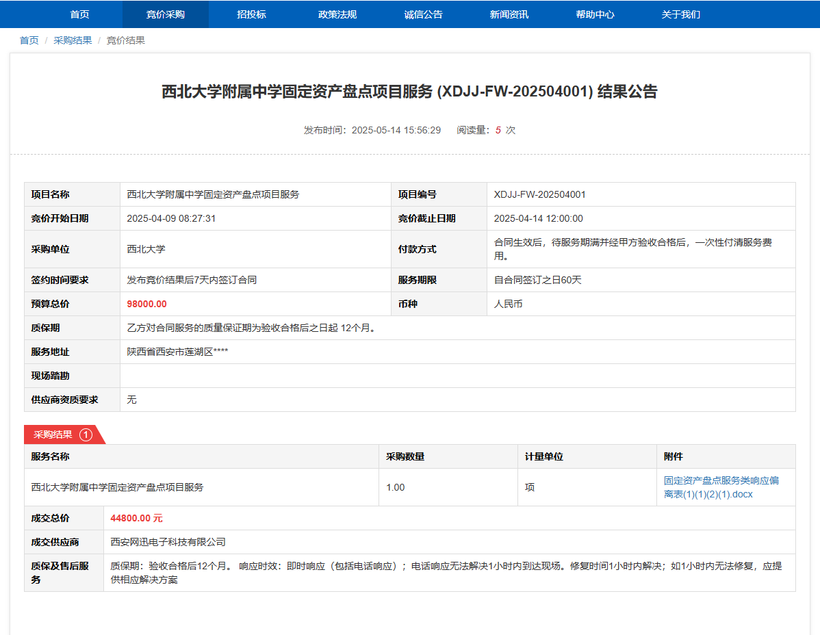 米兰买球附属中学固定资产盘点项目服务(XDJJ-FW-202504001)竞价结果公告 作者:采购与招标办公室 编辑: 时间:2025-05-14 原公告链接:https://www.ejingcai.com.cn/site/bidding/detail/18218